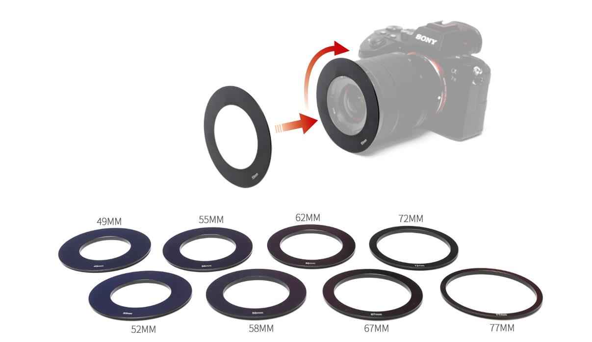 The TP2A with standard 49/52/55/58/62/67/72/77mm eight lens adapter rings. You can choose one which suit for your camera lens.