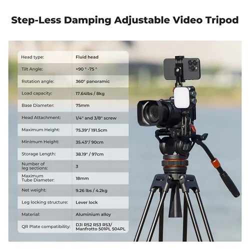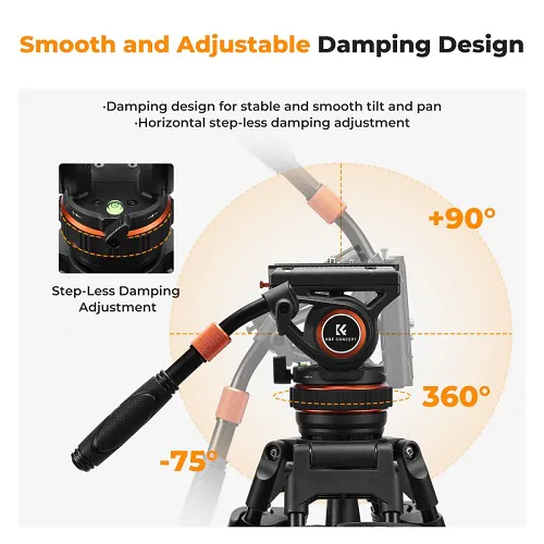 The hydraulic damping system guarantees smooth movement, allowing you to achieve vertical angle adjustments ranging from 75° to 90°.- Whether you’re filming a dynamic scene or capturing a static shot, this tripod provides the damping feel needed for professional-level shooting.